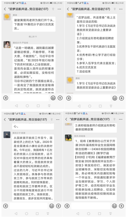 3月10日20:00,商务管理系学生党支部通过微信平台开展“启梦远航,共话青春”主题党日活动,党支部党员、入党积极分子、推优分子等共计137人参加本次活动。