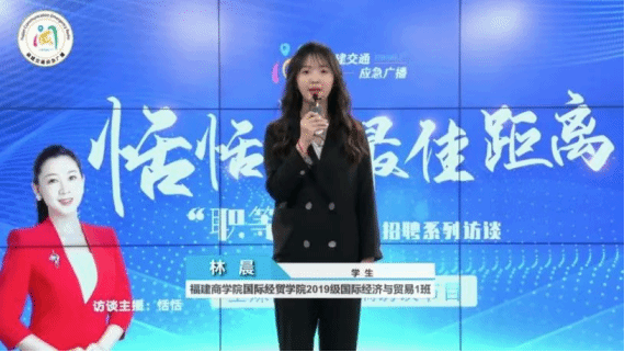 近日,bat365中文官方网站学生工作部携手1007福建交通广播全媒体高端互动访谈栏目《恬恬的最佳距离》,开展“职”等你来直播带岗(带人)特别节目。学院2019级国际经济与贸易1班林晨同学作为我校毕业生代表参加线上直播带岗,学院师生观看了本次直播活动。
