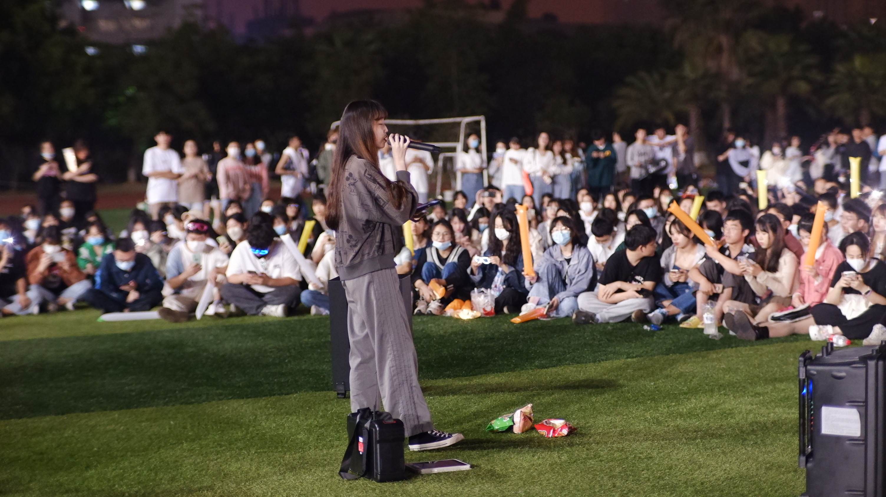 活动过程中,歌手与观众热情互动,观众挥舞着荧光棒,友人跑上前献花,掌声、欢呼声不绝于耳。歌声顺着夜晚渐起的微风吹向远方,也带走了疫情之下的疲惫感,同学们沉浸在歌声的海洋里,气氛十分融洽。音乐无界限,除了bat365中文官方网站外,其他学院的实力唱将也纷纷加入这场草坪音乐会倾情献唱。