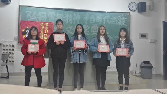 本次活动以雷锋精神主线,积极地倡导用文字传递雷锋精神,发扬雷锋精神,继承雷锋精神,赋予雷锋精神新时代内涵。参赛的作品形式多样,有诗歌、散文,小说等,充分展现了同学们优秀的文笔和参赛的积极性。经贸系全体师生积极参与到活动中来,纷纷用文字撰写了心中不同的雷锋精神。正所谓“赠人玫瑰,手留余香”把献爱之心化作爱的力量,让爱的翅膀畅翔于浩瀚蓝空,爱人者人恒爱之,爱心的作用是相互的,常怀献爱之心,沐浴着阳光成长,与爱同行。最终经贸系团总支书记宋俊樑老师对作品进行终审后,王碧贤同学获得了一等奖,黄嘉欣同学获得了二等奖,陈梦娇同学获得了三等奖,邓湘和虎静静同学获得了优秀奖,323日团宣部成员于教室111为获奖者颁发了奖品及证书。
