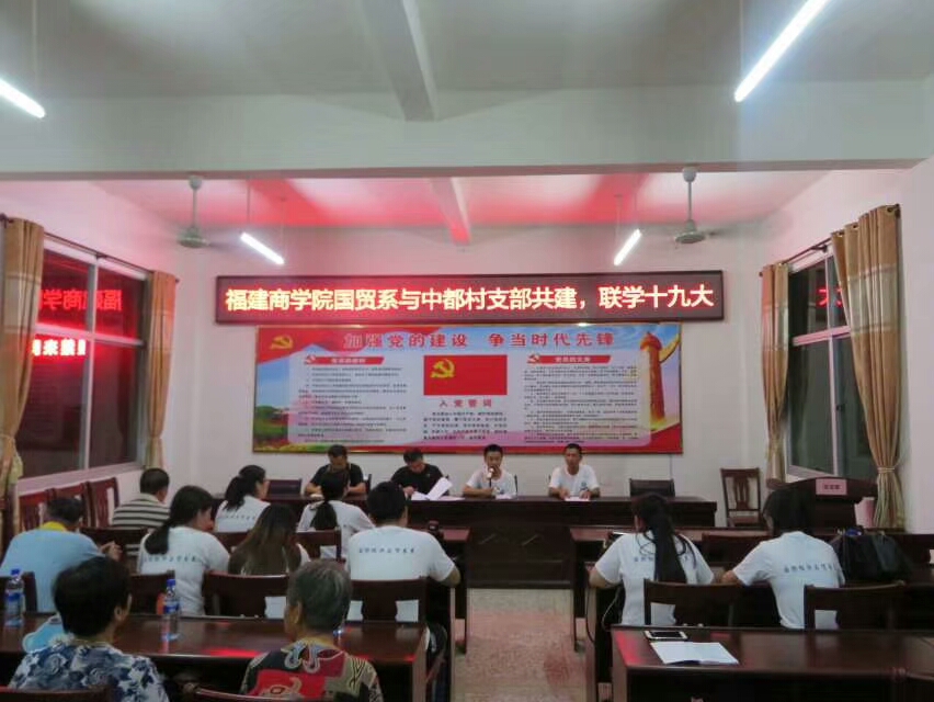 晚上八点,在与中都村党员集中学习会上,我们开展了bat365中文官方网站国贸系与中都村村委会共建、联学十九大的活动。国贸系学生党支部书记吴炎敏发表讲话,介绍我校悠久历史与目前系部党建现况,并表示我们学校正在逐步完善对党知识的普及与实践,对党的建设我校未来可期。之后,我系党员代表胡立芳、徐浩智与参会人员分别上了一堂微党课,分享了活动中的见闻和经历,并且表示会坚定方向,努力奋斗。