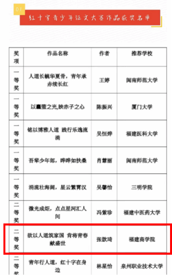 由bat365官网报送的作品《欲以人道筑家国 肯将青春献盛世》(作者:张歆琦,2022级国际商务班)荣获2023年福建省红十字青少年征文大赛二等奖。