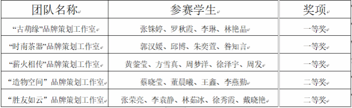 本次比赛参赛队伍众多,竞争激烈,在林晓怡、卢美琴、陈春玲、林明、陈盈、陈鸿娟等6位老师的悉心指导下,共有5支队伍经过层层选拔脱颖而出。其中“古葫缘”品牌策划工作室、“时南茶器”品牌策划工作室、“薪火相传”品牌策划工作室等3支队伍荣获一等奖;“造物空间”品牌策划工作室和“胜友如云”品牌策划工作室等2支队伍荣获二等奖。