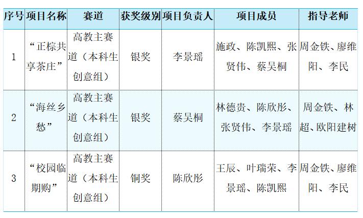bat365官网参赛项目“正棕共享茶庄”、“海丝乡愁”获得高教主赛道省赛银奖”,“校园临期购”项目获得高教主赛道省赛铜奖。