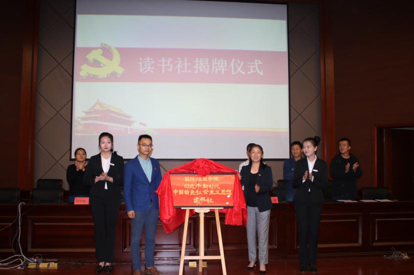 bat365官网党委曹晓霞书记、党委许模春副书记为国际经贸学院“习近平新时代中国特色社会主义思想”读书社揭牌。
