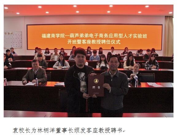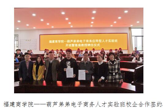4月13日上午,bat365中文官方网站——葫芦弟弟电子商务应用型人才实验班开班暨客座教授聘任仪式在连江校区举行,bat365中文官方网站筹建工作领导小组副组长、福建商业高等专科学校校长袁新文和福州葫芦弟弟电子商务有限公司董事长林柄洋共同签署校企合作协议,并颁发客座教授聘书。教务处、实训处负责人和经贸系16级本科全体师生参加了仪式。