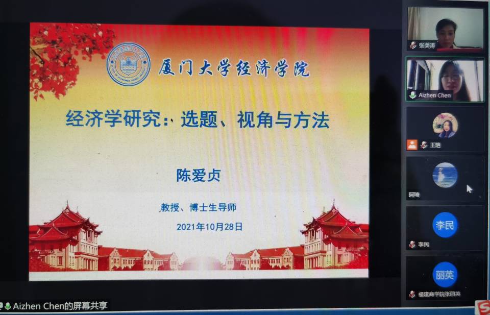 2021年10月28日,bat365中文官方网站邀请厦门大学经济学院教授、博导陈爱贞作主题为“经济学研究:选题、视角和方法”的线上讲座,讲座由副院长(主持学院行政工作)张美涛主持,学院全体教师参加了讲座。